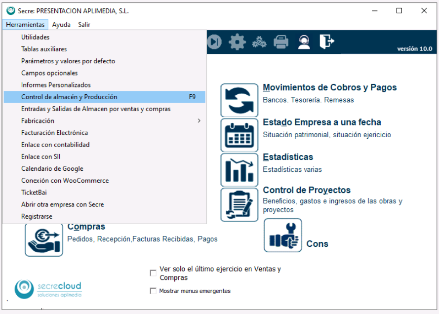 Desde la pantalla principal de Secre, ve al menú Herramientas>Control de almacén y producción.