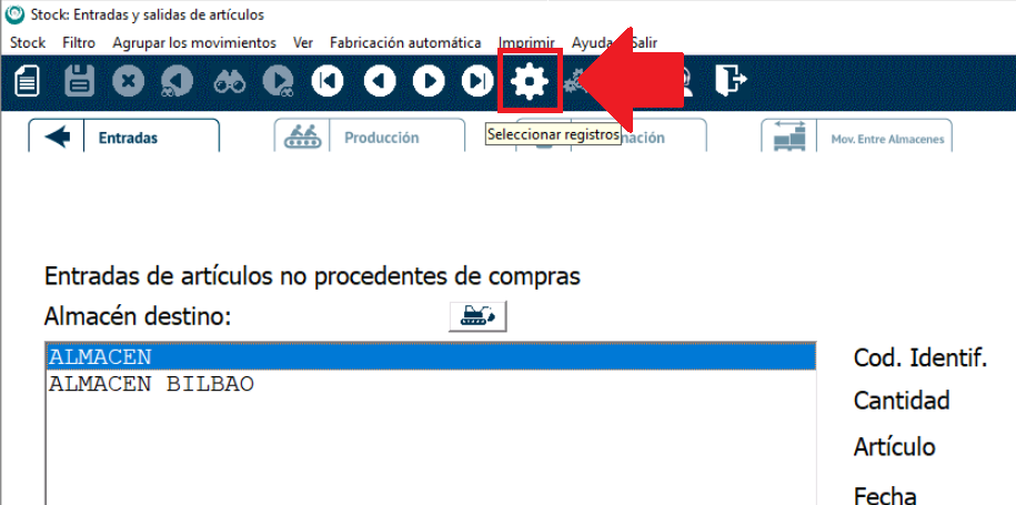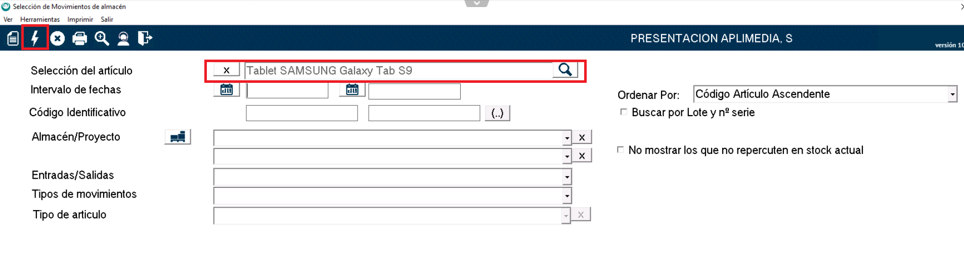 En este caso, como queremos ver los movimientos de un artículo, seleccionaremos el artículo en cuestión haciendo clic en la lupa a la derecha del campo «Selección del artículo».
