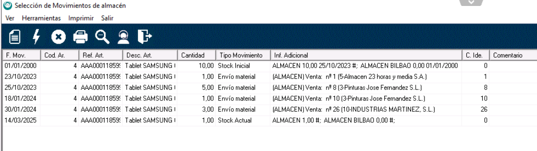 Con estos pasos, verás en pantalla el listado de movimientos del artículo seleccionado. En cada movimiento podrás ver el detalle de la cantidad, tipo de movimiento e información adicional (por ejemplo, el número de compra o venta del que procede el movimiento).