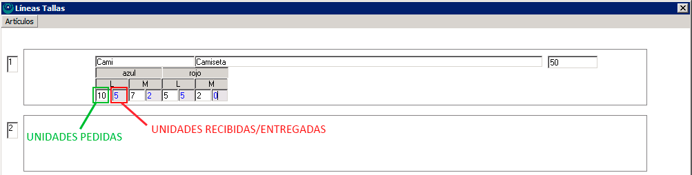Se nos abrirá una pantalla en la que, para cada Color/talla podemos indicar, en el cuadro de la izquierda, cuántas unidades hemos pedido (o nos han pedido si es una venta) y, en el cuadro de la derecha, cuántas unidades hemos recibido (o hemos entregado).