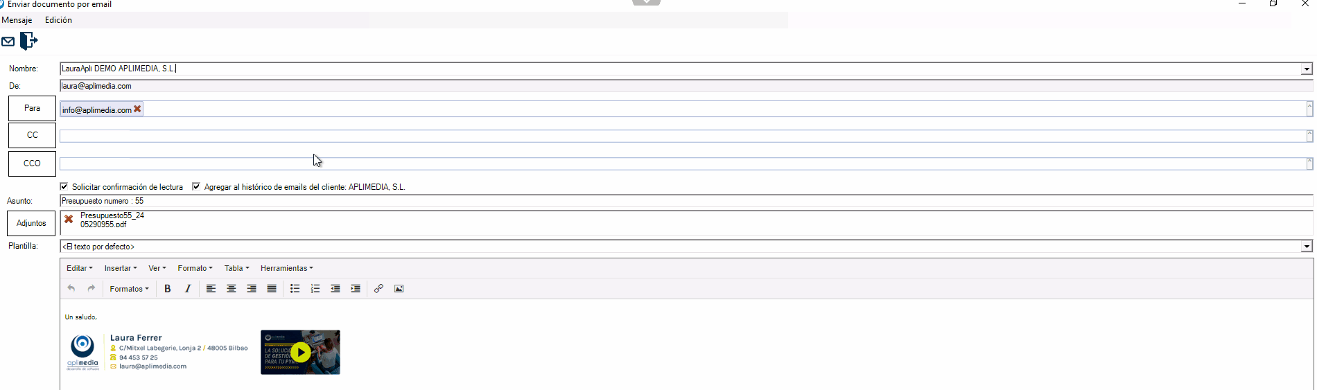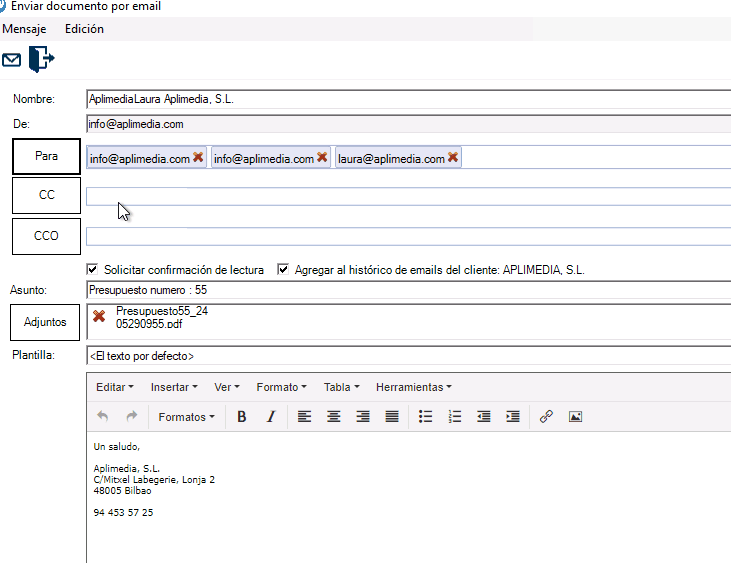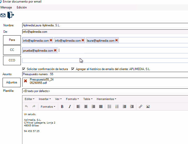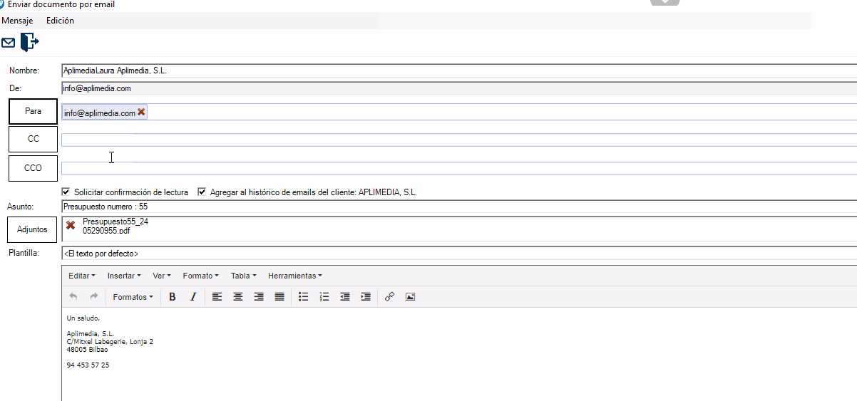 Como hemos comentado más arriba, si te encontraras con algún error o problema en el uso de esta nueva pantalla de envío de e-mail o en la creación de PDFs, no dudes en contactar con nosotros (en el 94 453 57 25 o en info@aplimedia.com) y notificárnoslo para que podamos solucionarlo lo antes posible.
