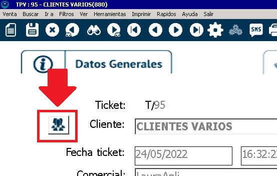Es decir, el ticket quedaría asignado a CLIENTES VARIOS, pero podríamos vincularle datos de un cliente. Para ello, simplemente haríamos clic en el botón que hay a la izquierda del nombre del cliente: