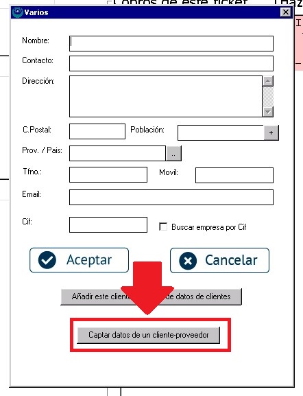 Si el cliente no está en nuestra base de datos, podemos rellenar los datos en esta pantalla. Pero también podemos captar los datos de un cliente que ya figure en nuestra base de datos, con el botón que aparece en la parte inferior «Captar datos de un cliente-proveedor»: