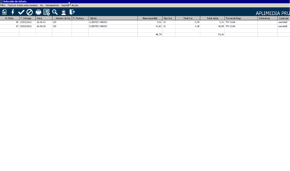 Del mismo modo en que, como hemos visto en el punto anterior, podríamos facturar un ticket a un cliente distinto al que figura en él (habitualmente a Clientes Varios), también podemos facturar varios tickets desde un listado, a un cliente distinto al que tienen asociado.