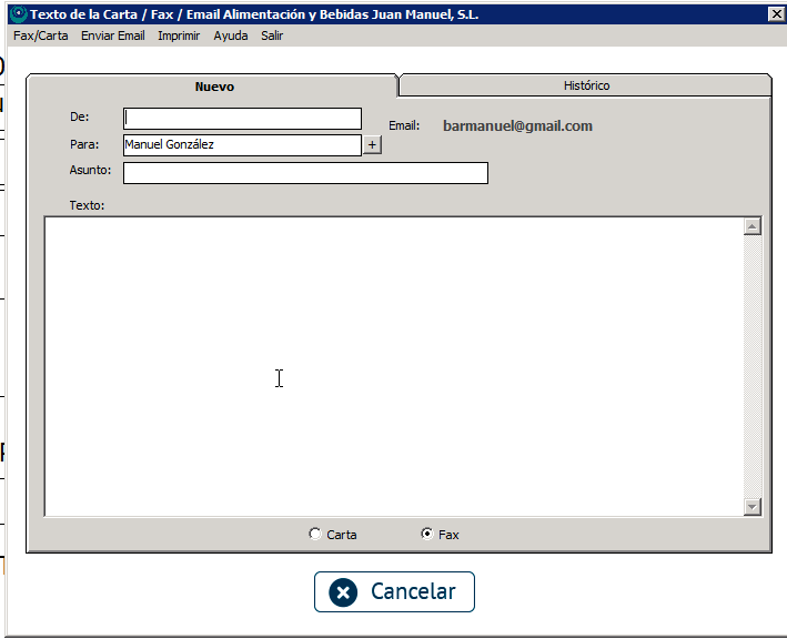 Los pasos son tan sencillos como rellenar en «De» nuestro nombre, en «Para» el del cliente o proveedor al que se destina la carta o fax, introducir un Asunto y, en «Texto», un cuerpo de la carta o fax.