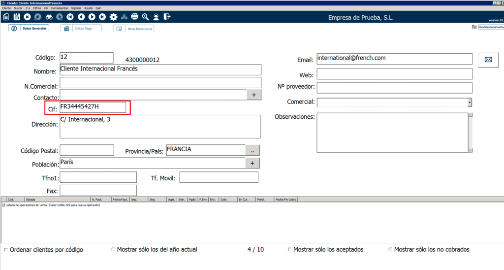 El campo CIF varía ligeramente cuando nuestro cliente es internacional, ya que en estos casos se suele trabajar con el VAT.