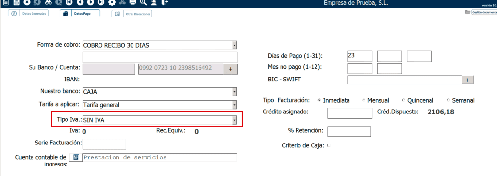 Lo más habitual cuando trabajamos con clientes internacionales es que no tengamos que aplicarles el IVA. Por lo tanto, así deberemos indicarlo en la pestaña de datos de pago.