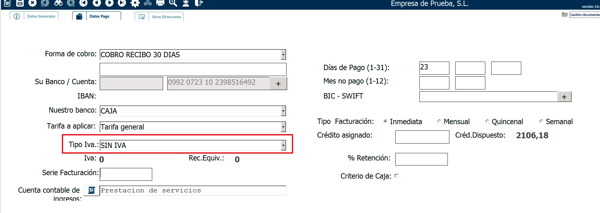 Para ello, dentro de la pestaña «Datos Pago«, y en el campo «Tipo IVA«, selecciona del desplegable la opción «SIN IVA«.