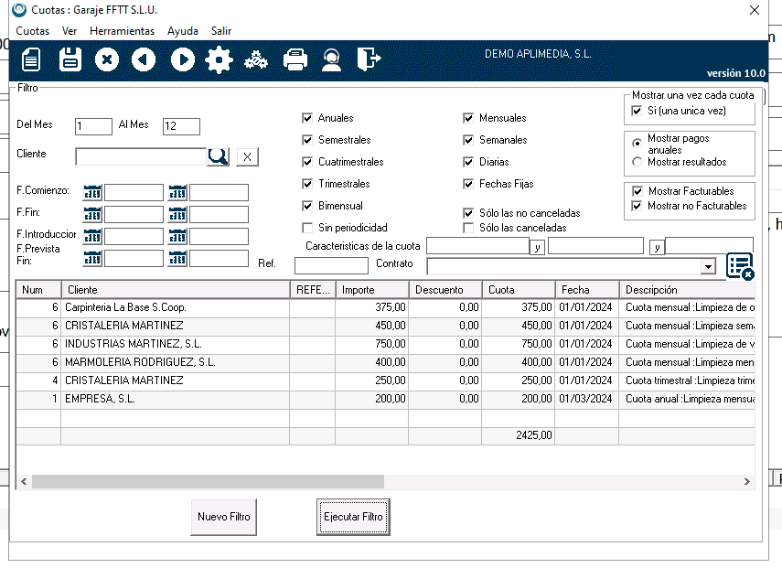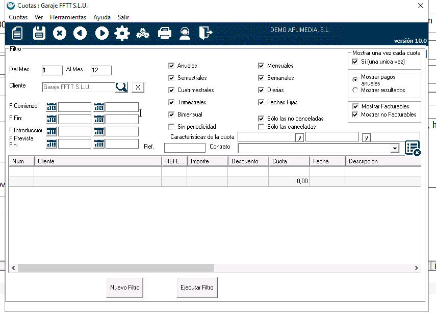 Cuando hayas seleccionado los criterios que te interesen, haz clic en Ejecutar filtro, y el listado se actualizará con las cuotas que cumplan las condiciones seleccionadas: