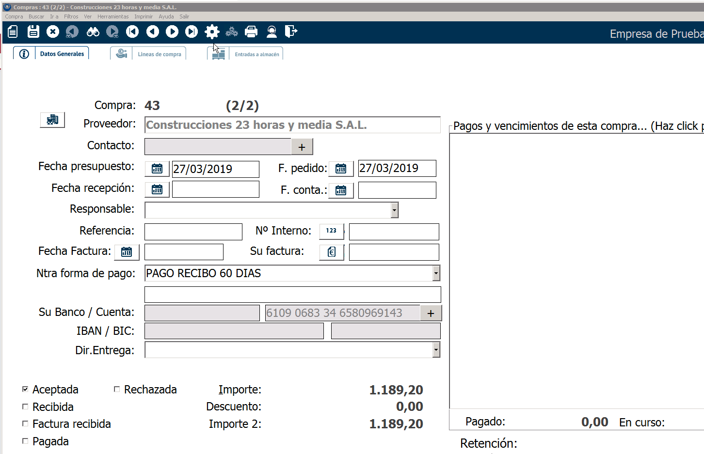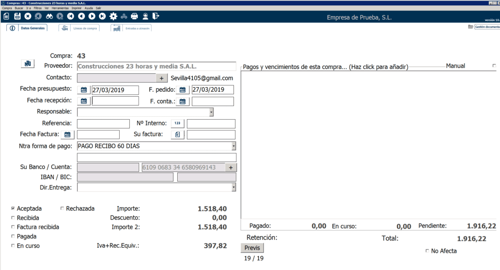 Si vuelves, en la compra original, a «Datos generales» verás que este pedido ya se ha convertido en albarán de compra y, por tanto, ya tiene fecha de recepción asignada. Podríamos facturarlo como una compra normal.