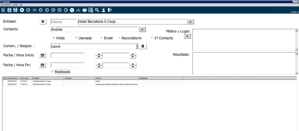 Una de las funcionalidades más interesantes de la parte CRM del programa es el poder llevar un control de las visitas, llamadas, emails, recordatorios…