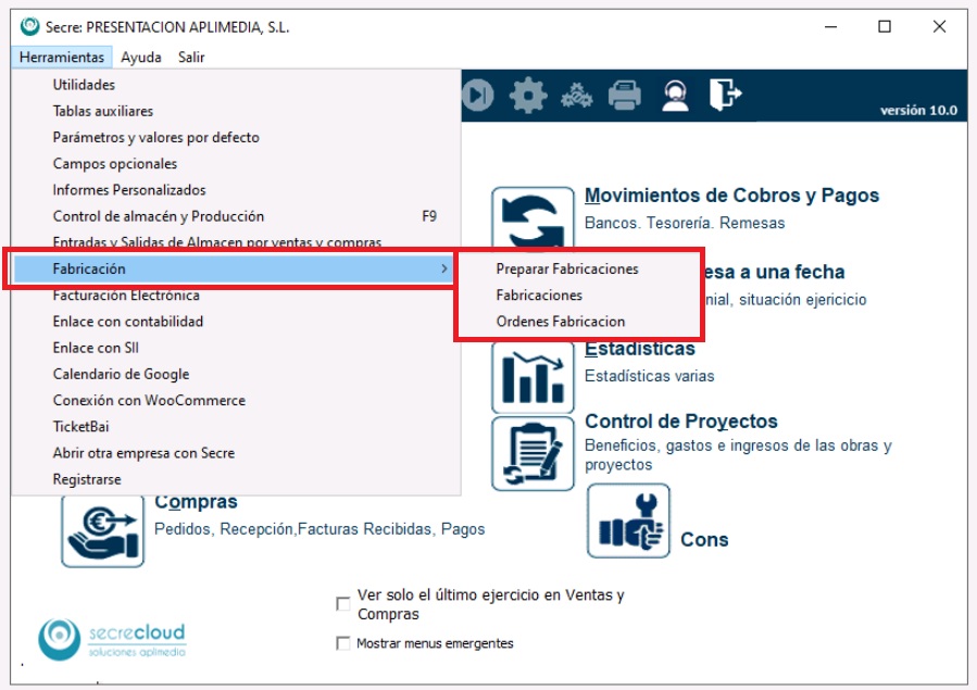 Sabrás que está activado porque, si despliegas el menú Herramientas, desde la pantalla principal del programa, verás una nueva opción que dice Fabricación, que es desde donde podrás acceder a las pantallas del módulo.