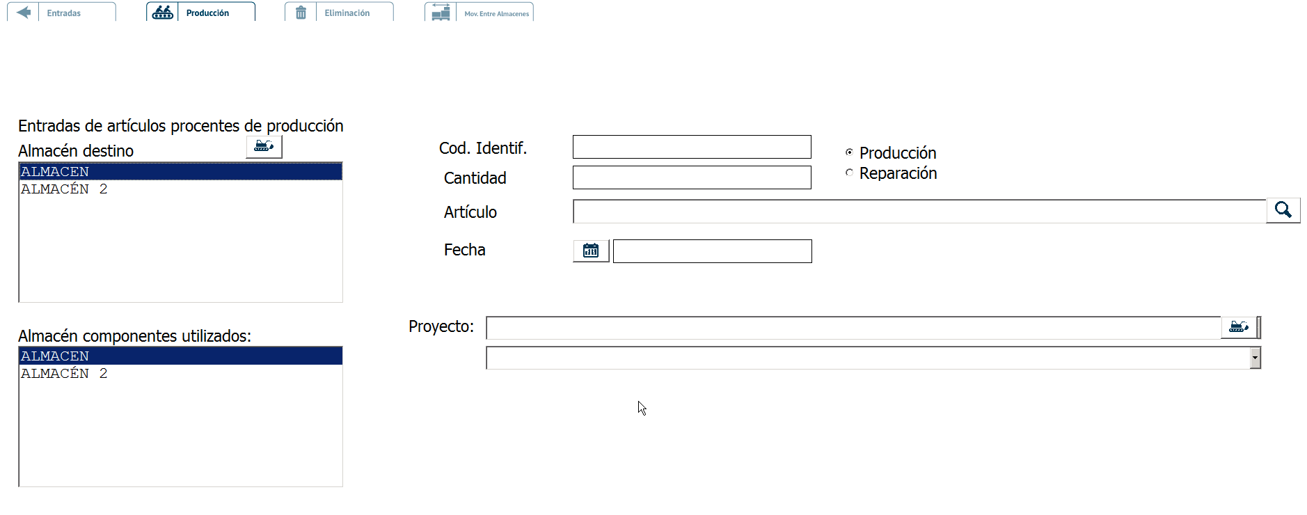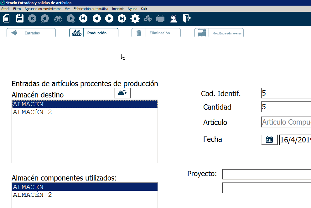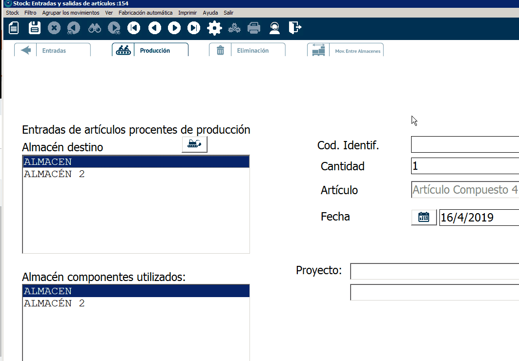 El funcionamiento es sencillo: escogemos el almacén de origen (de dónde salen los componentes) y el de destino (a dónde van los artículos fabricados). Le asignamos un código que identificará esa fabricación e indicamos el artículo que vamos a fabricar, la cantidad y la fecha en que lo hacemos.