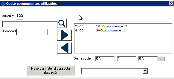 Podríamos modificar la cantidad de un componente si ya lo hemos introducido previamente, seleccionándolo, modificando la cantidad, y utilizando la flecha que apunta hacia la derecha: