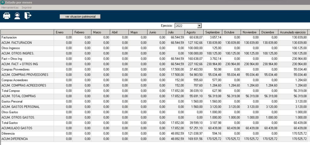 Como puedes ver en el pantallazo, Secre desglosa los ingresos y gastos y nos muestra también cada dato de forma acumulada a lo largo del ejercicio.