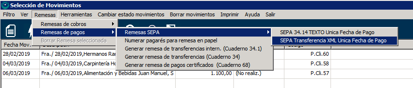 Podemos realizar remesas bancarias, tanto de cobros como de pagos, desde la pantalla Movimientos de Cobros y Pagos de Secre.
