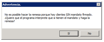 A la primera pregunta «¿Quiere que el programa interprete que si tienen el mandato y haga la remesa?«, puedes marcar que sí.