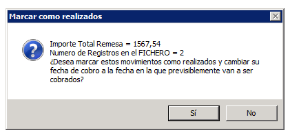 En el segundo caso, a la pregunta «¿Desea marcar estos movimientos como realizados y cambiar su fecha de cobro a la fecha en la que previsiblemente van a ser cobrados?«, puedes escoger Sí o No en función de cómo prefieras trabajar.