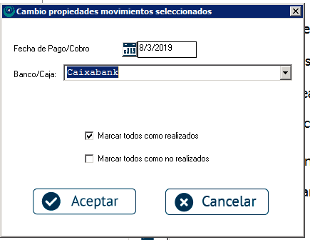 Con el listado de movimientos de la remesa en pantalla, ve a la opción del menú superior Cambiar Estado Movimientos. Simplemente tendrás que indicar la fecha del pago o el cobro que corresponda y el banco por el que remesaste los movimientos, marca la casilla «Marcar todos como realizados» acepta y, automáticamente, se marcarán como cobrados o pagados.