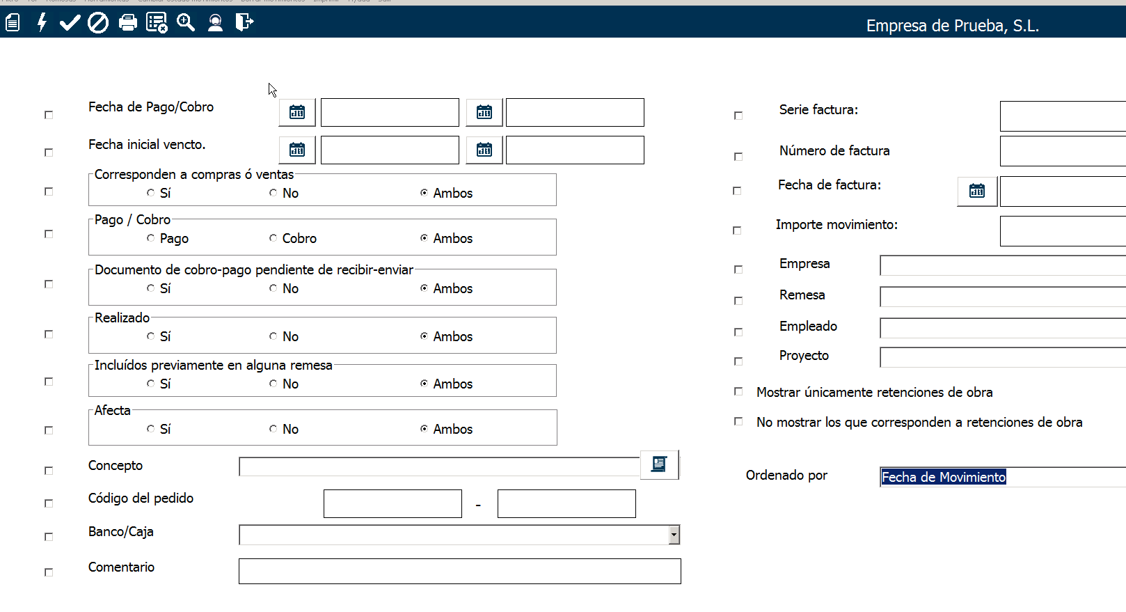 A partir de aquí, añade los criterios que necesites: un rango de fecha de pago o cobro, determinadas fechas de factura, o determinadas fechas de vencimiento, movimientos de una empresa en concreto, etc.