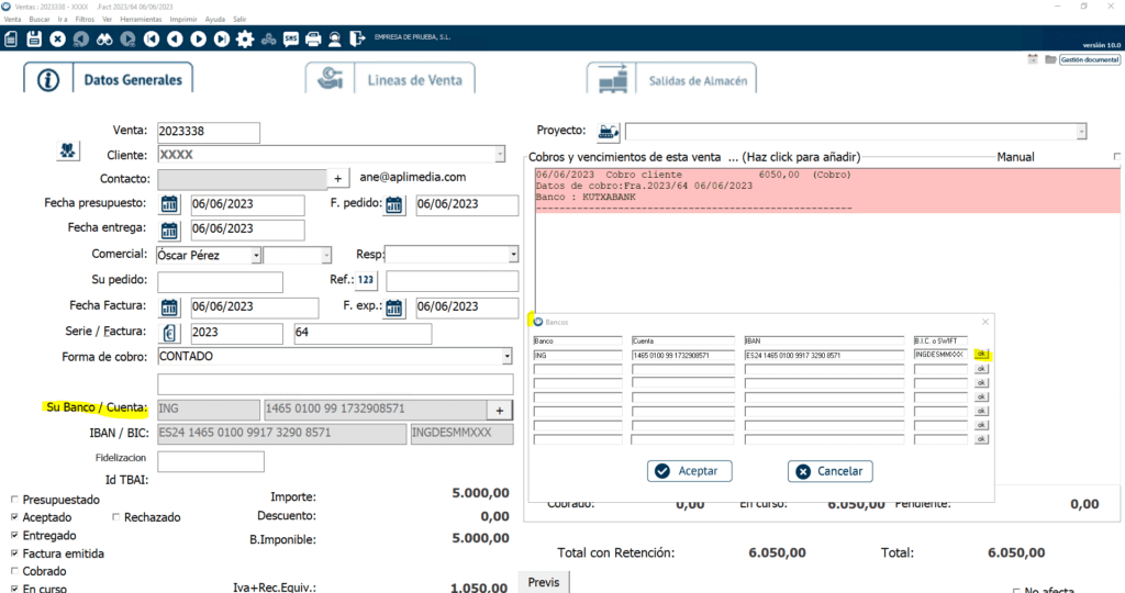 Una vez seleccionada una cuenta bancaria del cliente, las ventas que le generemos se crearán con dicha cuenta bancaria asociada.