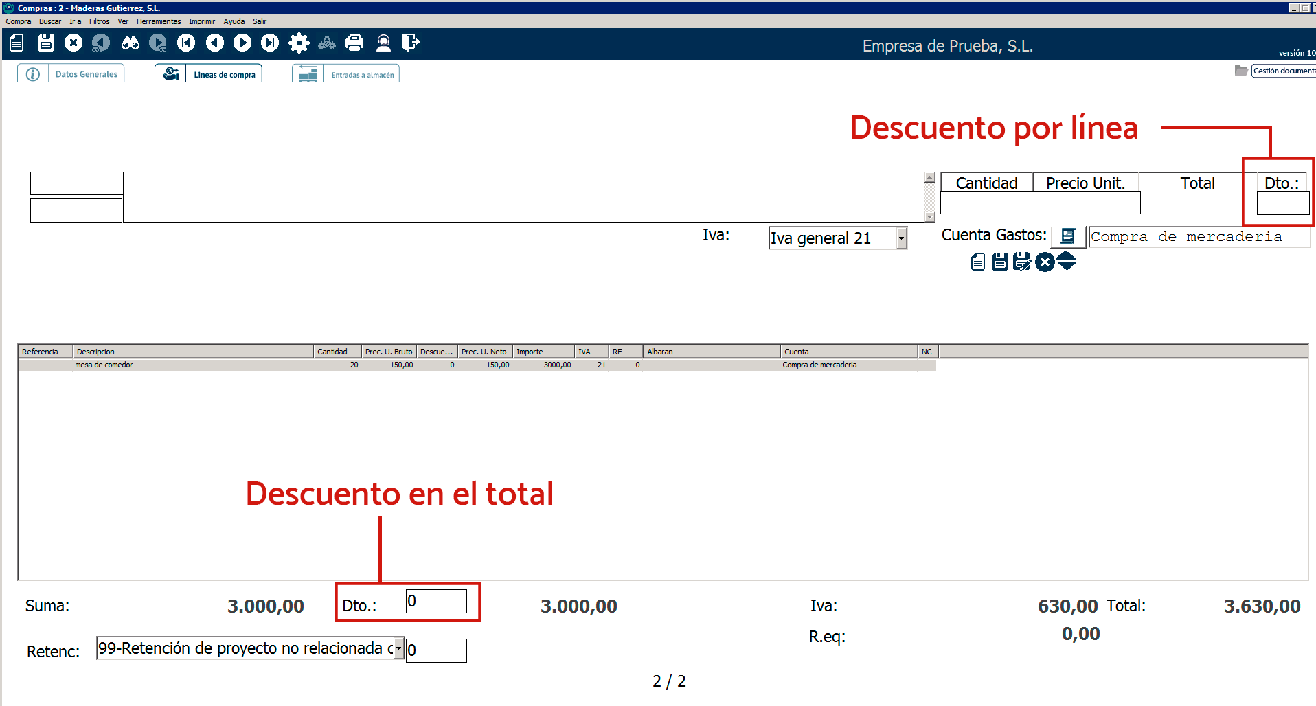 Para ello, dentro de la compra, hacemos click en la pestaña «Líneas de compra»