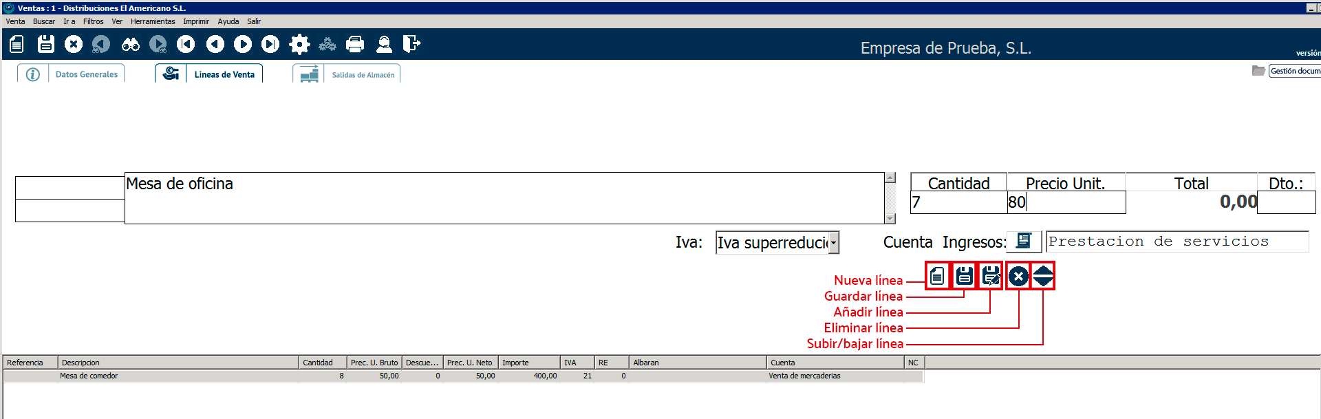 - Podemos escribir texto directamente en el campo de descripción de la línea y, a continuación, rellenar los datos de cantidad, precio unitario y, si procede, descuento. Esta es la opción que te interesa cuando es un artículo o servicio que, por cualquier motivo, no has registrado en tu base de datos de Artículos y Servicios (ni te interesa registrarlo). Las líneas que introduzcas de esta manera no generarán movimientos de almacén.