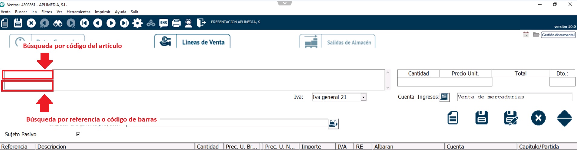 - Si conoces el código, código de barras o la referencia del artículo, puedes buscarlo directamente sin necesidad de abrir la pantalla de artículos. Para ello, puedes utilizar los dos pequeños cuadros que hay a la izquierda del campo de la descripción. Con el de arriba puedes buscar por el código del artículo y, con el de abajo, por la referencia o código de barras.