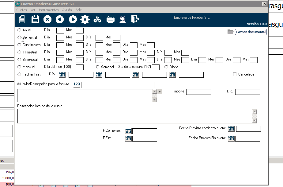 Si, por ejemplo, quisiera establecer una cuota mensual que se te factura el día 15 de cada mes, seleccionaría mensual e introduciría 15 en el campo «día del mes». Si, en otro supuesto, nos pasaran factura tres veces al año, seleccionaríamos cuatrimestral y le asignaríamos los días y meses que correspondan.