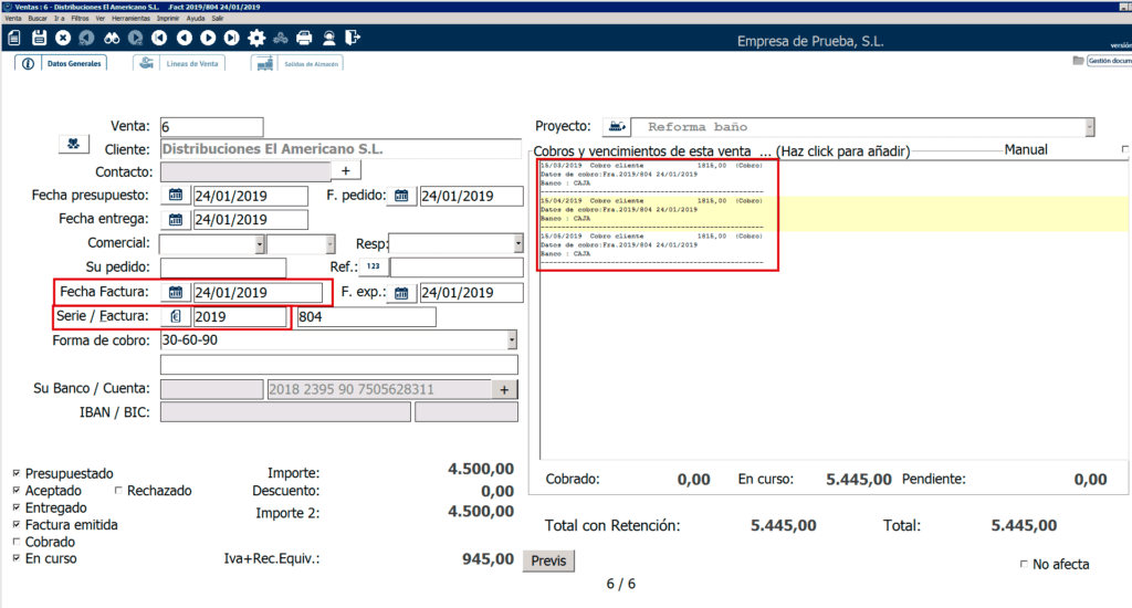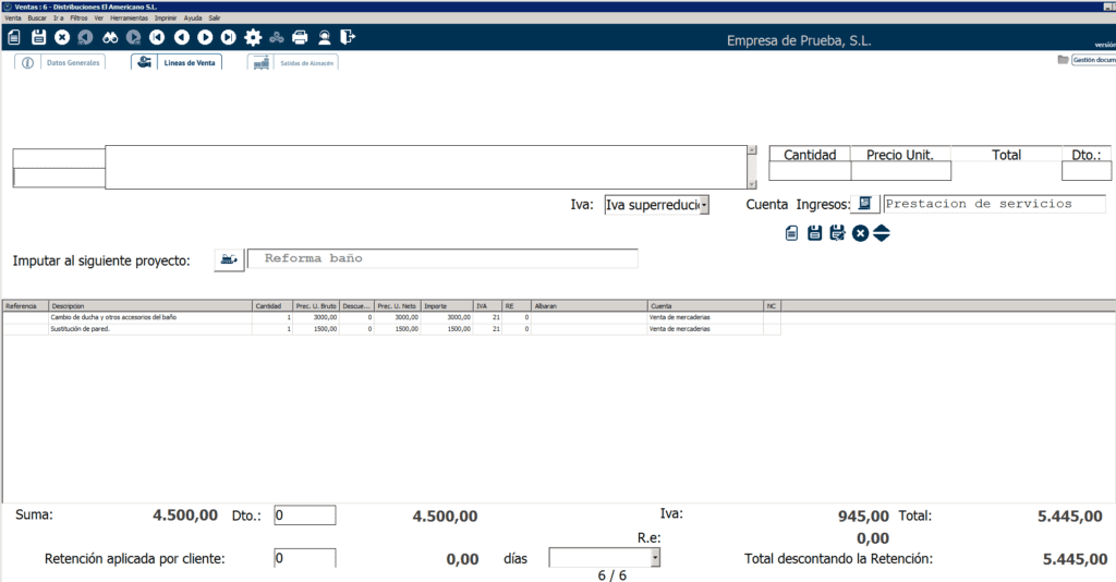 El programa trasladará los datos del proyecto a la venta y, si vas a la pestaña «Líneas de venta«, verás que cada línea de venta corresponde a las descripciones que introdujiste para cada uno de tus capítulos con el importe que presupuestaste.
