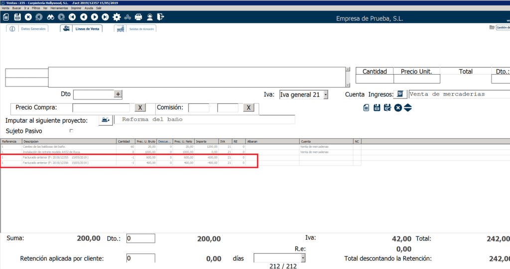 Para este ejemplo ya he hecho dos facturas anteriores para las dos mediciones anteriores, por eso, al estar trabajando a origen, al facturar esta venta nos añade dos líneas que restan lo facturado anteriormente: