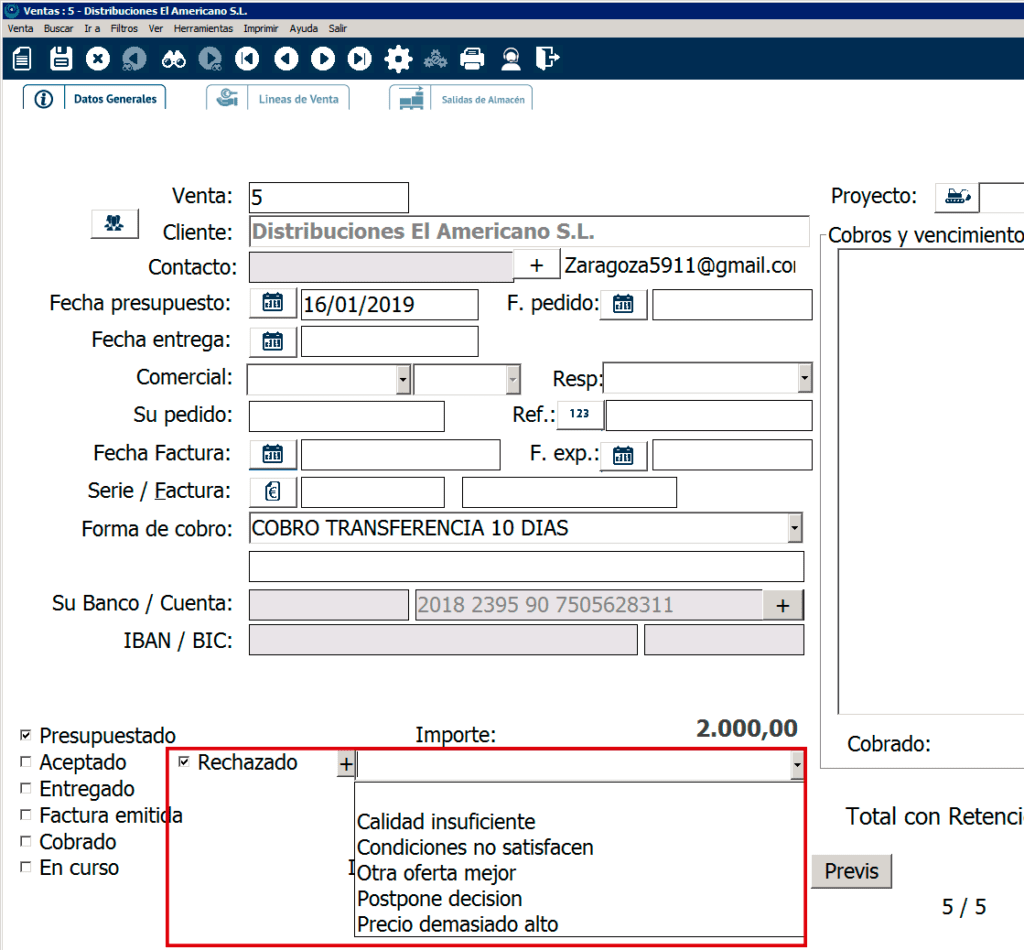 Si tu cliente rechazara el presupuesto, puedes marcarlo como Rechazado en la parte inferior izquierda de la pestaña «Datos generales» de la venta. Puedes indicar el motivo haciendo click en el «+» que te aparecerá a la derecha.