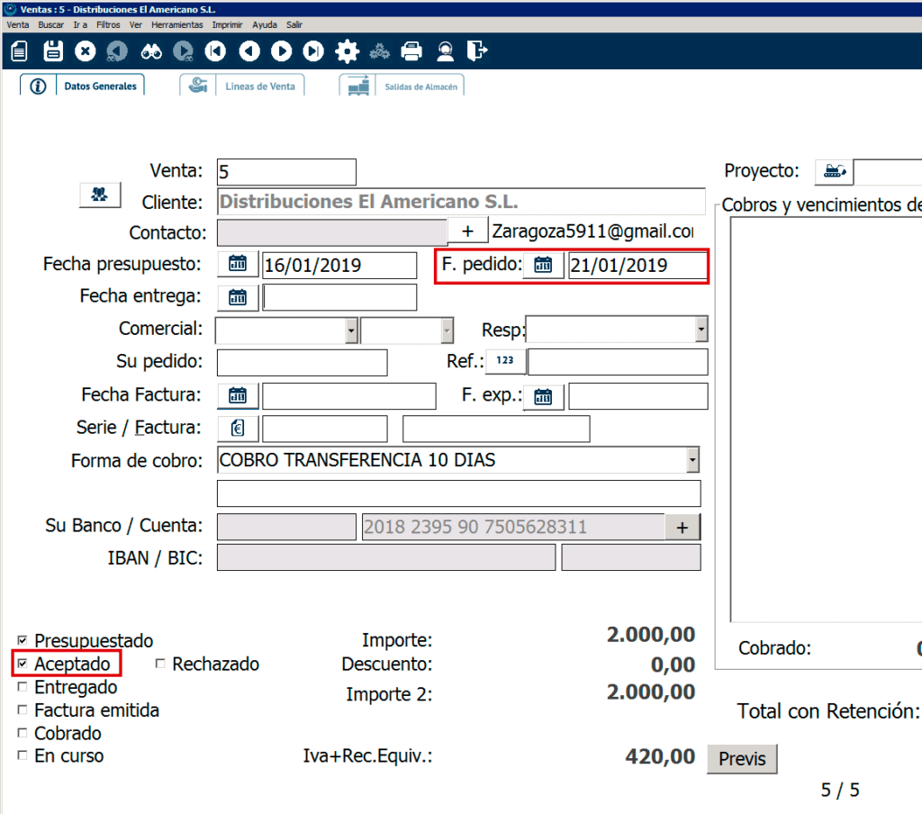 Si, por el contrario, el cliente acepta el presupuesto, puedes marcarlo como aceptado e indicar la fecha de aceptación en el campo «F. pedido«.