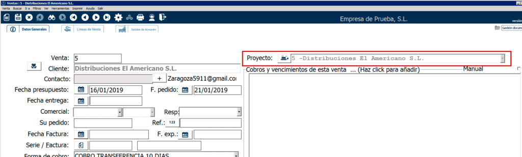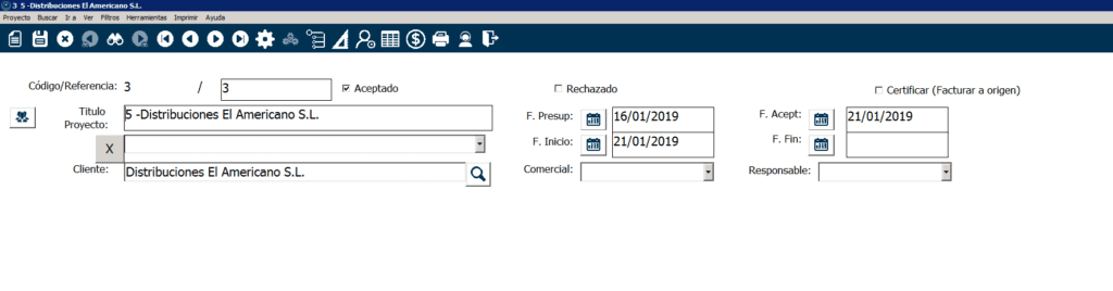 El proyecto ya está creado, como verás en el campo «Proyecto» del presupuesto. El programa asigna a ese proyecto el mismo código que el de la venta a partir de la cual lo creas.