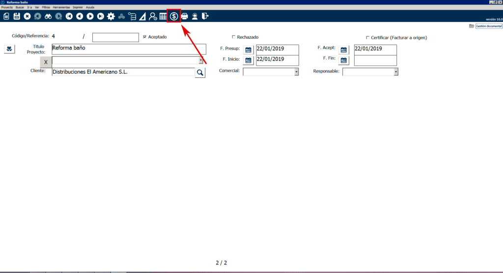 Una vez estés en él (puedes navegar entre todos tus proyectos con las flechas de la barra superior o buscarlo con los prismáticos), pincha en el botón «Resultado económico del proyecto«, representado con el icono del dólar: