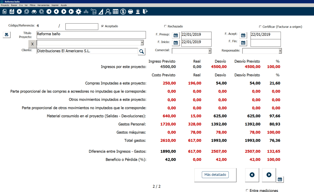 Se te abrirá la siguiente pantalla donde puedes consultar los resultados económicos del proyecto. En este ejemplo todavía no hemos facturado el proyecto y por eso, los ingresos reales por el proyecto están a 0€, pero como puedes ver, el programa va haciendo cálculos en función de los gastos que se han imputado en relación a los que se presupuestaron para que en todo momento puedas ver los desvíos que se están produciendo: