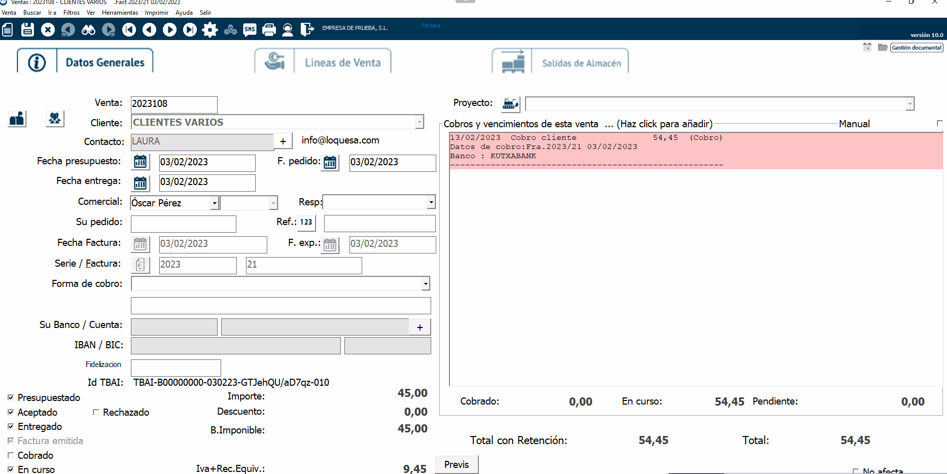 En el módulo de ventas sabrás que una venta ha generado TicketBai porque los campos fecha de factura, fecha de expedición y serie / numero de factura quedarán bloqueados (además de las líneas).