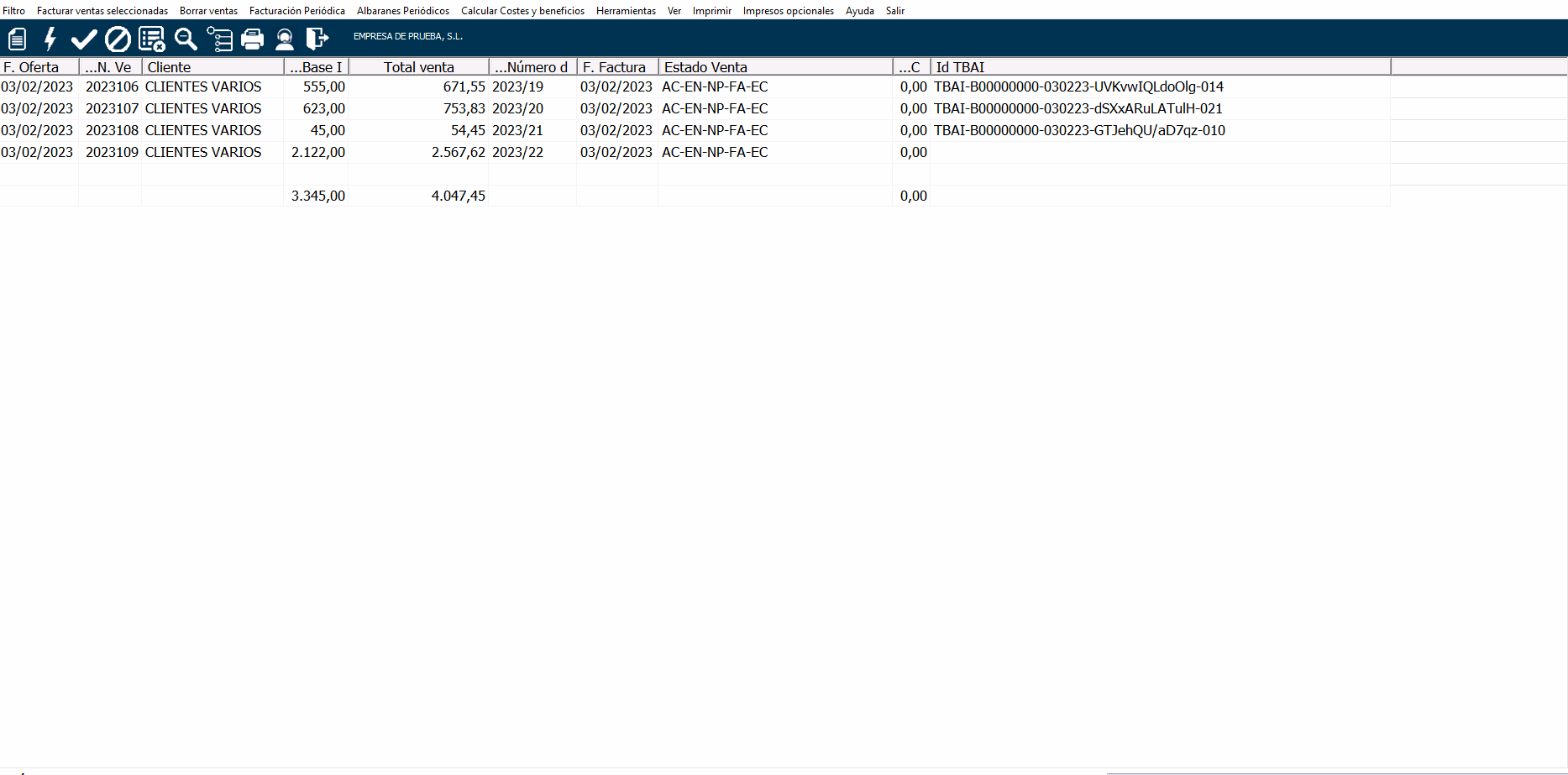 En el listado verás el ID-TBAI, si lo tiene es porque has generado TicketBai, si no es porque está pendiente de generar el TicketBai de esa factura. Si haces clic en la cabecera de la columna te agrupará las que no lo tengan generado.