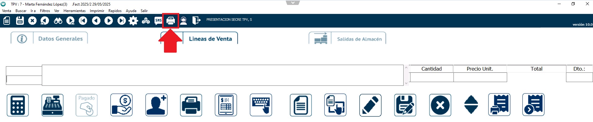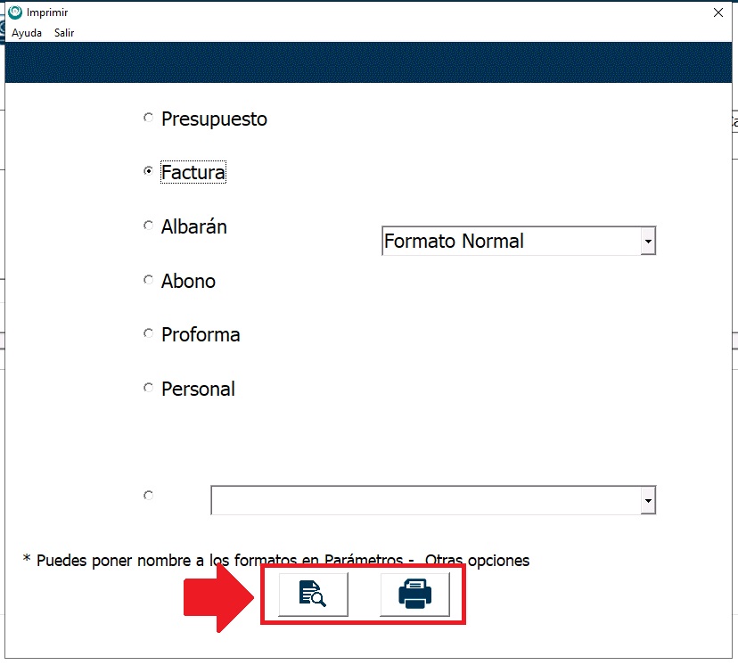 Para imprimir o enviar la factura al cliente, pincha en el icono de la impresora del menú superior y selecciona la hoja con la lupa para previsualizar el documento y enviarlo por e-mail o el icono de la impresora si quieres imprimirlo directamente.