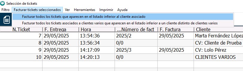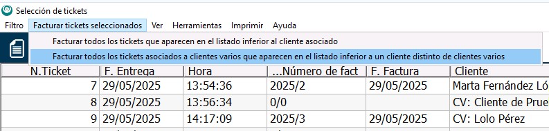 En este caso, los pasos son los mismos que se describen en el punto anterior: deberemos filtrar aquellos tickets que queremos facturar, pero en el menú Facturar tickets seleccionados seleccionaremos la opción Facturar todos los tickets asociados a CLIENTES VARIOS que aparecen en el listado inferior a un cliente distinto de CLIENTES VARIOS.