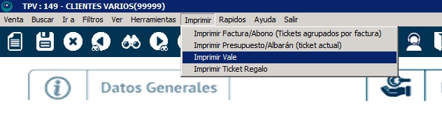 Para generar el vale que vamos a entregar al cliente, iremos a Imprimir>Imprimir vale. El número del vale es el número del ticket, que puedes ver en la pestaña Datos generales.