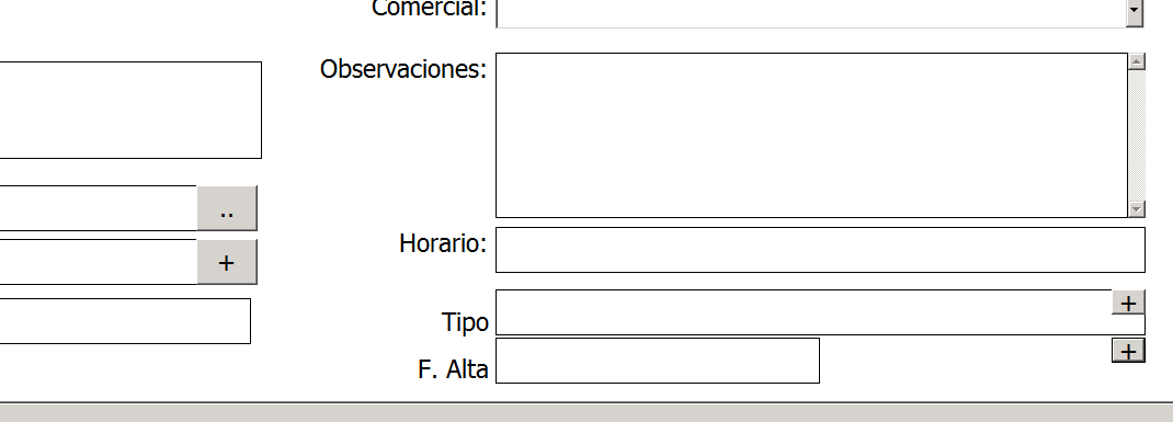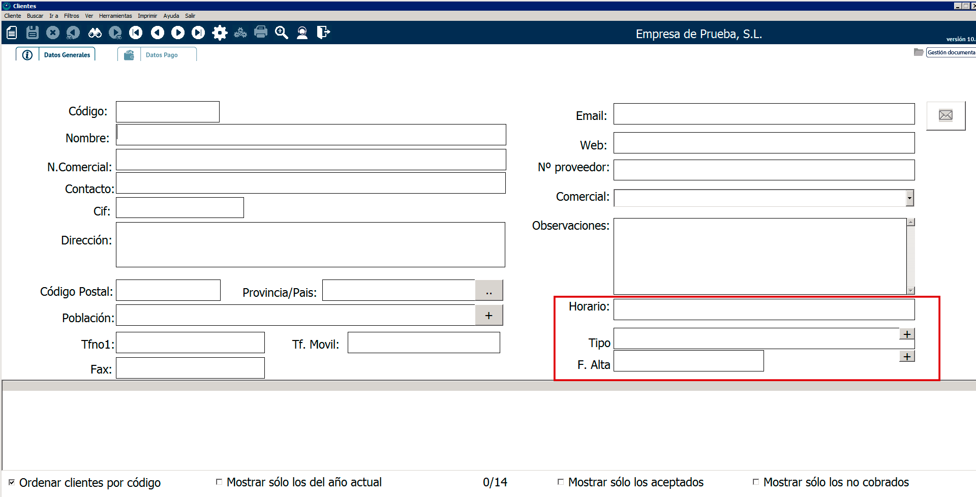 En este ejemplo hemos creado dos campos opcionales para Clientes y, además, hemos marcado la casilla horario. Ahora, si vamos a la pantalla de Clientes, vemos que se han creado los tres campos extra en la parte inferior derecha: