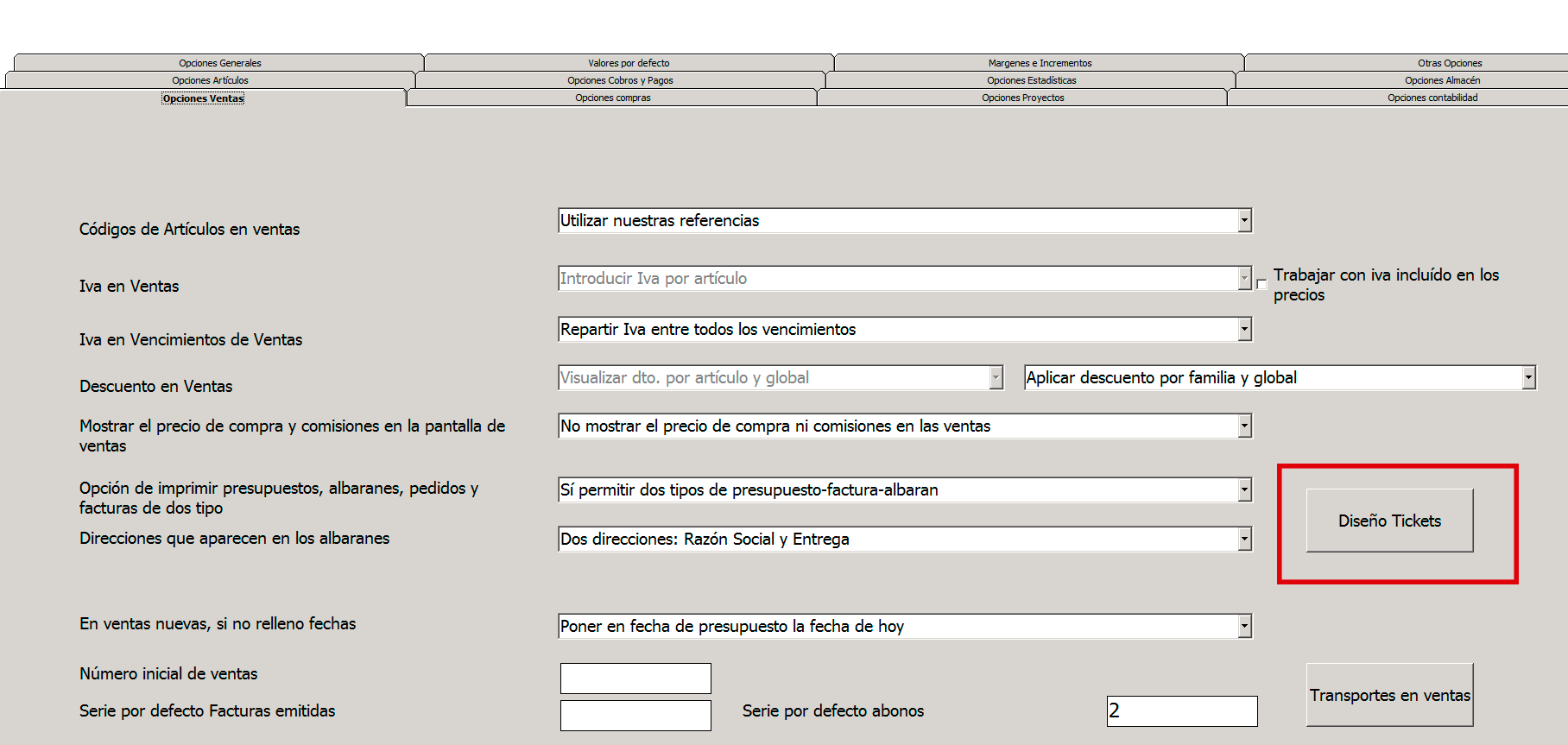 Para acceder a la pantalla de configuración del diseño de tus tickets, desde la pantalla principal del programa accede a Herramientas>Parámetros y valores por defecto, y después ve a la pestaña Opciones Ventas. Dentro de esta pestaña verás un botón que se llama Diseño tickets, haz click en él.