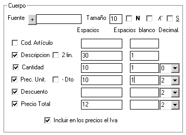 Simplemente se trata de marcar las casillas de la información que quieres que aparezca en tu ticket. La columna «espacios» hace referencia al número de caracteres máximo para ese dato, la columna «espacios blanco» indica los espacios en blanco que hay que dejar tras esa línea. La columna «Decimal» te permite indicar el número de caracteres a incluir si se trata de un valor numérico.
