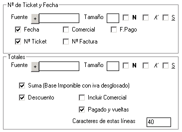 La sección Nº de Ticket y Fecha se imprime justo encima del cuerpo del ticket y te permite escoger entre varios datos a mostrar: Fecha, comercial que ha realizado la venta, fecha de pago, nº de ticket y nº factura. Simplemente marca las casillas de los datos que quieres que se muestren.