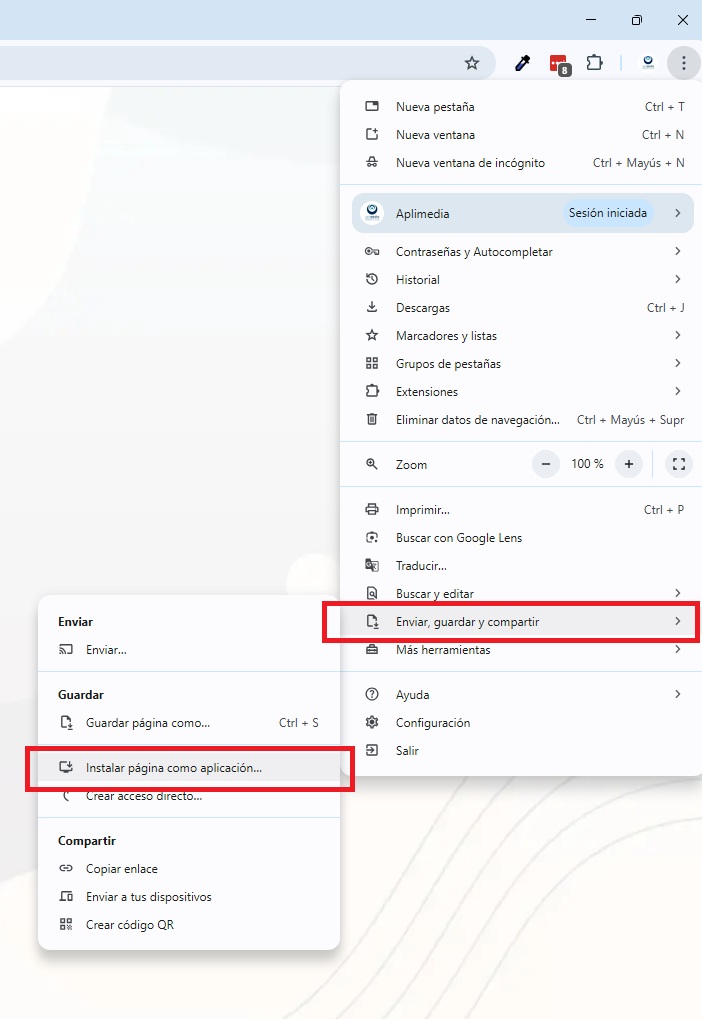 Selecciona la opción Enviar, guardar y compartir>Instalar página como aplicación.