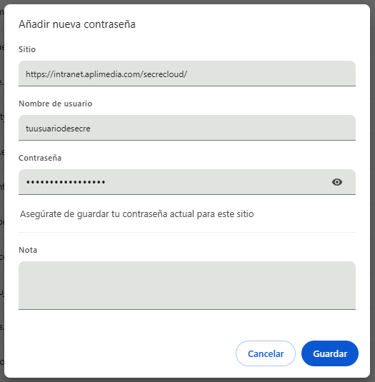 Pincha en Guardar y ya lo tendrías, a partir de ahora tus credenciales se rellenarán automáticamente al abrir la página de inicio de sesión de Secre.