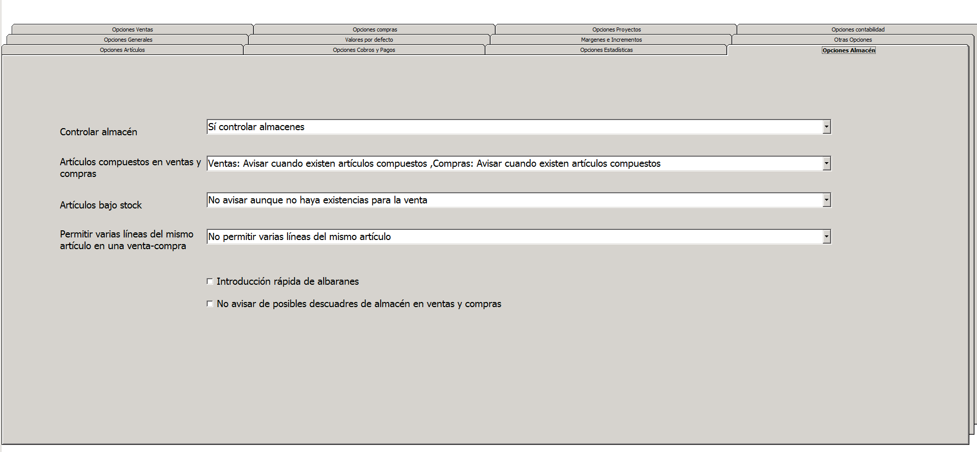 Vamos a ver con más detenimiento las opciones que tenemos para configurar los parámetros de almacén.