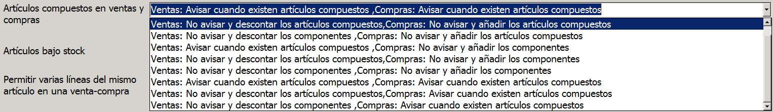 Si trabajas con artículos compuestos, bien porque te dedicas a la fabricación, bien porque vendes sets o packs de productos, deberás escoger qué quieres que haga el programa cuando vendes o compras un artículo compuesto.