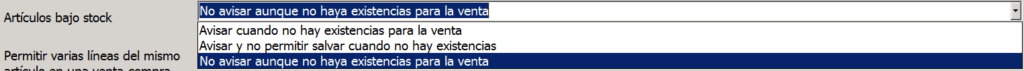 Aquí configuraremos qué queremos que haga el programa cuando realizamos una venta de un artículo bajo stock. Tenemos tres opciones: